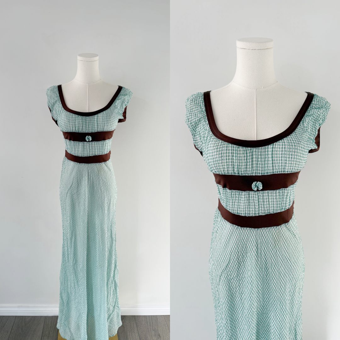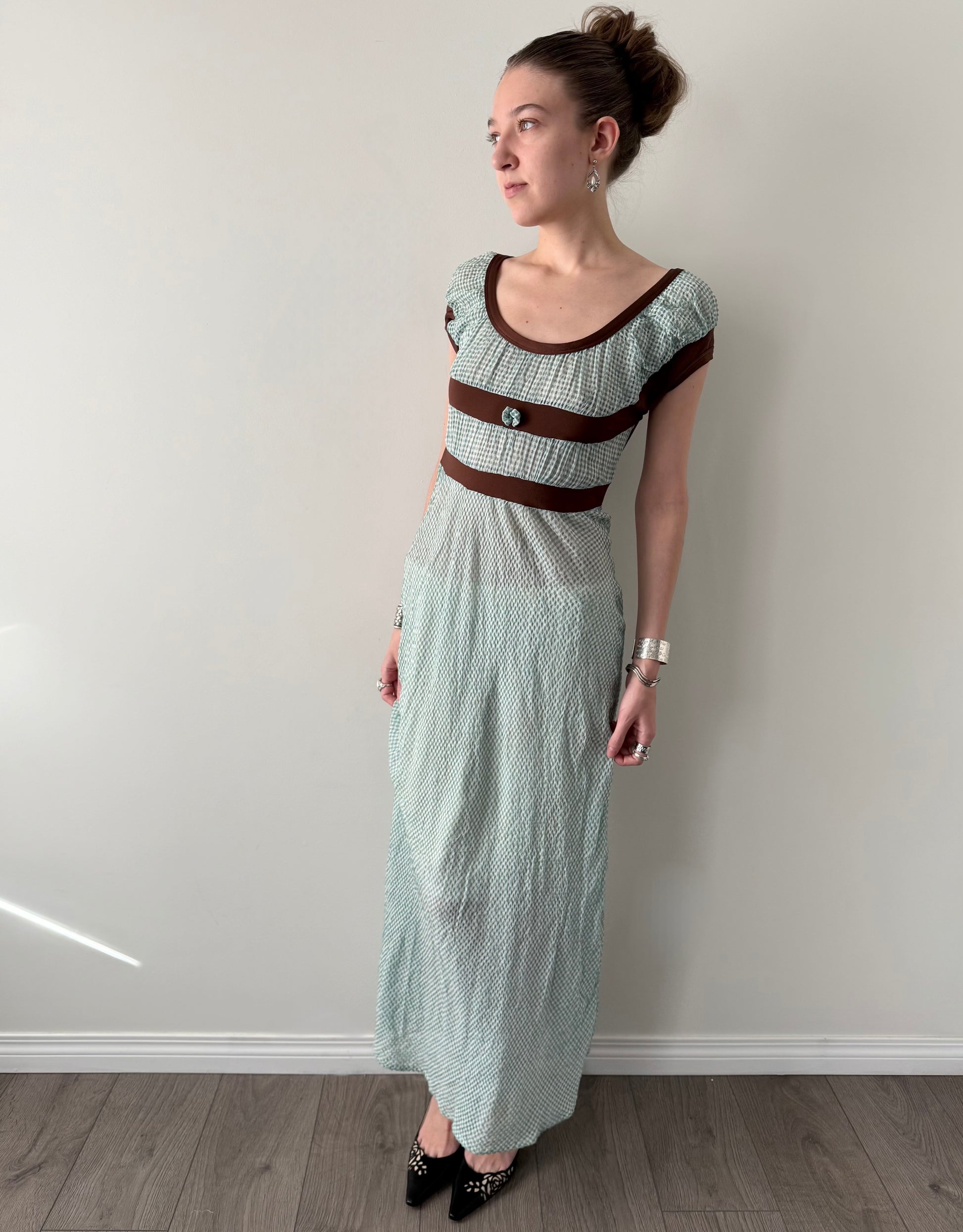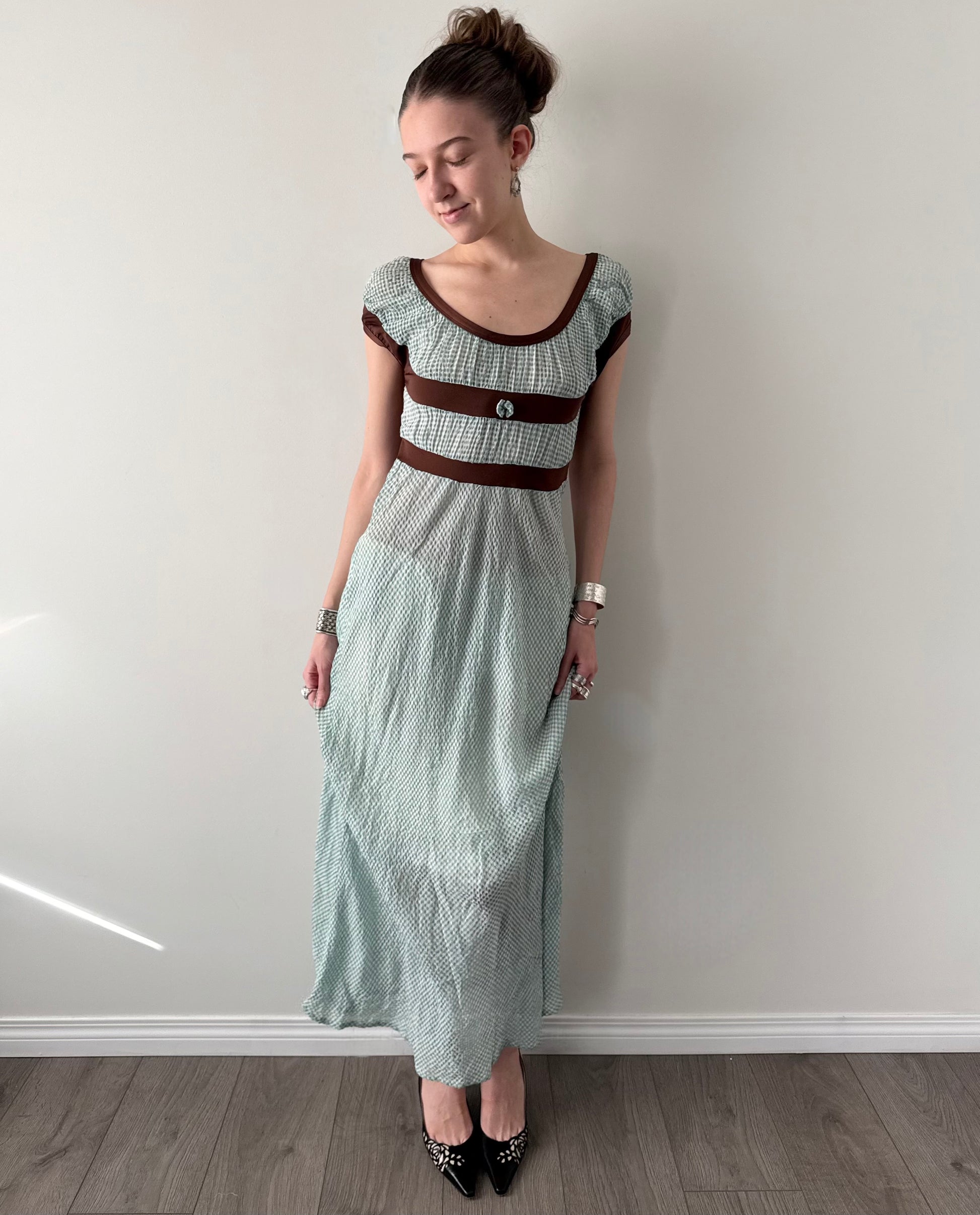Jean Paul Gaultier gingham empire mesh maxi dress.